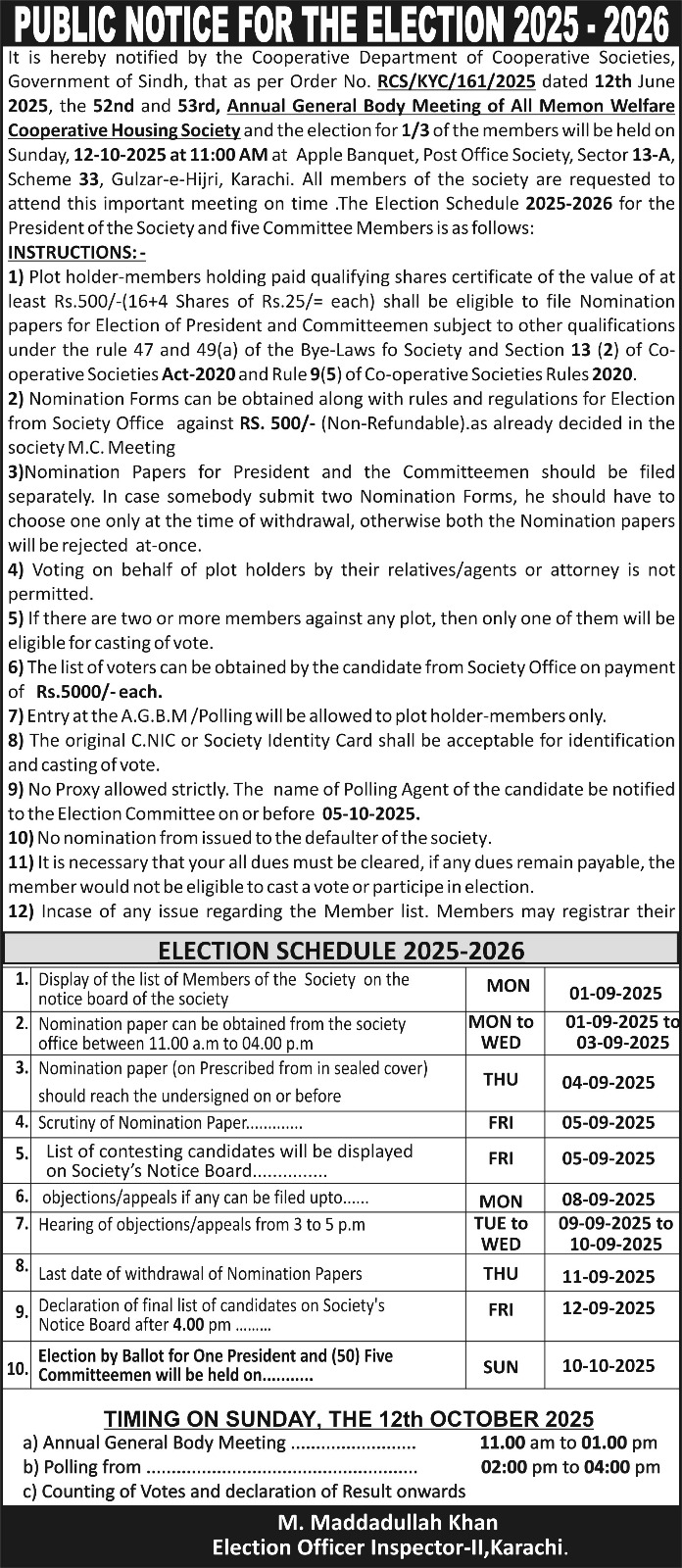 Read MoreIt is notified for the information of all plot holder members of ALL MEMON WELFARE COOPERATIVE HOUSING SOCIETY LIMITED,